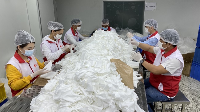 3月1日,交通實業(yè)公司第三批戰(zhàn)役支援服務隊員接替第二批隊員上崗,繼續(xù)助力東莞久林吉良凈化用品有限公司口罩生產(chǎn)。