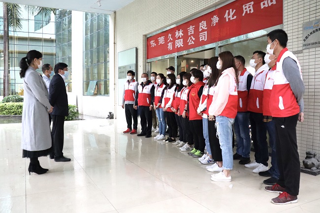 3月4日下午,交通實業(yè)公司黨總支部副書記、監(jiān)事劉拓瑜,黨總支部委員、副總經(jīng)理李敬超帶領慰問組一行到久林吉良凈化用品公司,看望慰問第三批戰(zhàn)疫支援服務隊員,詳細了解他們的工作安排和安全防護情況,叮囑大家在高強度的工作下注意休息,量力而行,保證自身安全。