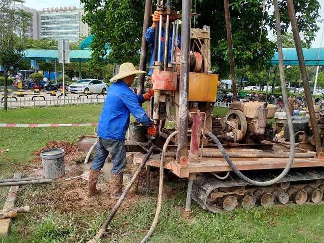 工程鉆探區(qū)域包括市人民醫(yī)院內(nèi)、萬道路和河涌旁,共需布置勘探孔111個,存在著地面交通復雜、地下管線多、權(quán)屬單位多等諸多困難和挑戰(zhàn)。為此,公司組織勘察單位提前調(diào)取相關(guān)地下管線資料并進行了物探,最大限度降低鉆探破壞既有設施的風險。目前,勘察單位正加大投入、加班加點開展鉆探,整體地質(zhì)勘察工作計劃于8月25日完成。