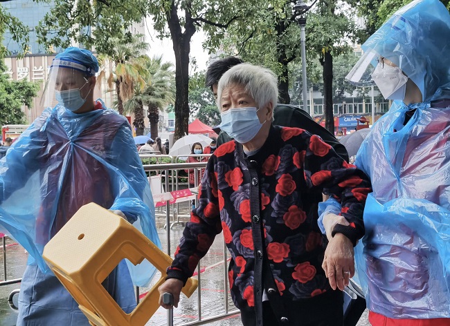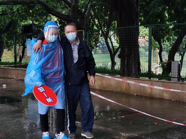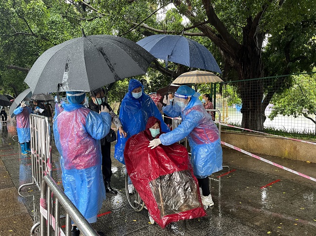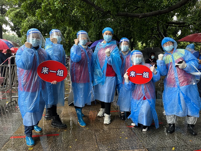 在核酸檢測現(xiàn)場,一場大雨不期而至,并伴隨大風(fēng)降溫,給緊鑼密鼓進(jìn)行核酸檢測的醫(yī)護(hù)人員和志愿者們帶來諸多不便。盡管風(fēng)雨打濕了褲角,模糊了面罩,給現(xiàn)場工作增加很多難度,但卻絲毫沒有動搖志愿者們戰(zhàn)“疫”必勝的決心。寒風(fēng)冷雨中,志愿者們始終堅守在各自的崗位,耐心做好維持疏導(dǎo)秩序、分流人員、引導(dǎo)群眾掃描二維碼、協(xié)助社區(qū)老年人完成亮碼操作等工作,用愛堅守、無私付出,努力為社區(qū)核酸檢測工作高效推進(jìn)保駕護(hù)航。核酸檢測工作持續(xù)至深夜十點,雖然疲累,但志愿者們毫無怨言,默默堅守崗位。他們的身影在夜幕中閃閃發(fā)光,照亮了市民的臉龐,溫暖了群眾的心靈,展現(xiàn)了共產(chǎn)黨員的責(zé)任與擔(dān)當(dāng)。