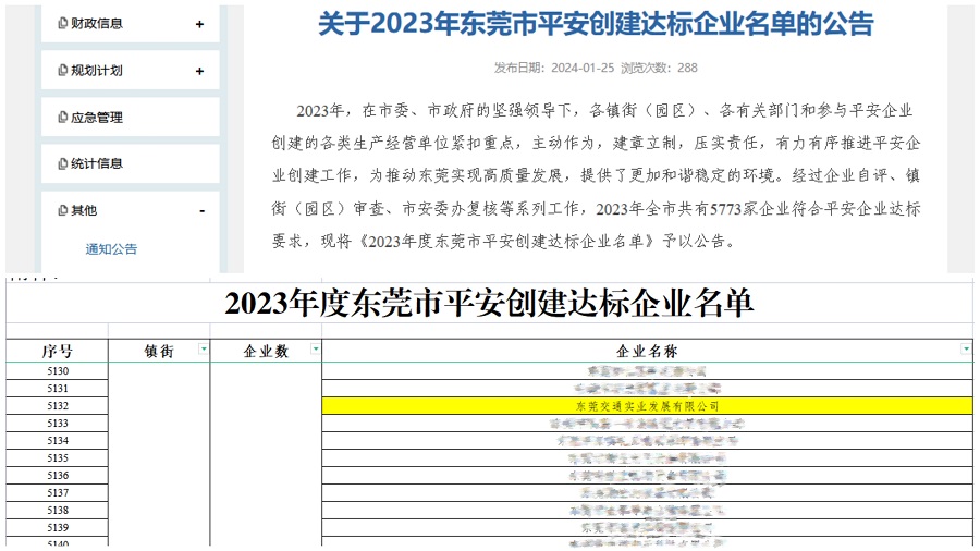2023年,交通實(shí)業(yè)公司將平安企業(yè)創(chuàng)建行動(dòng)作為年度安全生產(chǎn)重點(diǎn)任務(wù)推進(jìn),一年來(lái)通過(guò)動(dòng)員部署,全面落實(shí)推進(jìn)平安企業(yè)創(chuàng)建行動(dòng),嚴(yán)格完善及主動(dòng)積極申報(bào),經(jīng)過(guò)企業(yè)自評(píng)、 鎮(zhèn)街(園區(qū)) 審查、市安委辦復(fù)核等系列工作后,符合平安企業(yè)達(dá)標(biāo)要求,榮獲東莞市“平安企業(yè)”稱號(hào)。