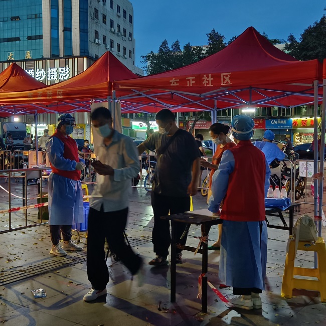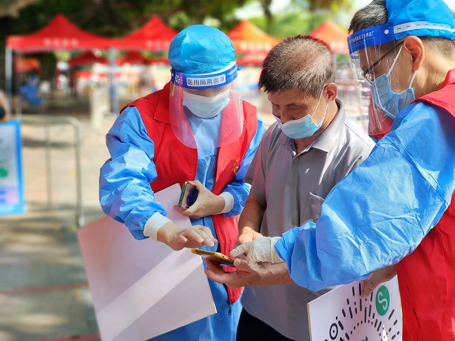 當(dāng)天,志愿者們穿上紅馬甲,向市民講解檢測(cè)流程和注意事項(xiàng),核驗(yàn)場(chǎng)所打卡碼、核酸檢測(cè)碼,疏導(dǎo)人流,維持秩序,保障核酸采樣工作有序進(jìn)行。在高溫天氣下,志愿者們身上的防護(hù)服被汗水浸濕,但他們?nèi)匀?/span>堅(jiān)守崗位、盡職盡責(zé),努力協(xié)助社區(qū)完成核酸檢測(cè)任務(wù)。晚上9時(shí),核酸檢測(cè)支援服務(wù)結(jié)束,他們還主動(dòng)留下收拾現(xiàn)場(chǎng)物資,堅(jiān)持站好志愿服務(wù)最后一班崗,充分發(fā)揮黨員先鋒模范作用,彰顯國(guó)企形象。