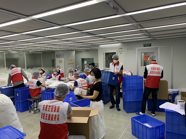 3月1日,交通實(shí)業(yè)公司第三批戰(zhàn)役支援服務(wù)隊(duì)員接替第二批隊(duì)員上崗,繼續(xù)助力東莞久林吉良凈化用品有限公司口罩生產(chǎn)。